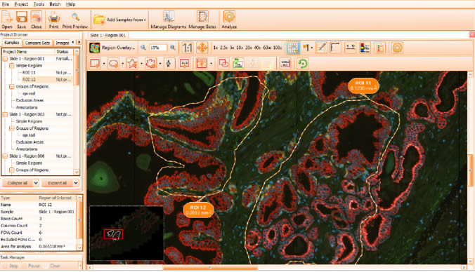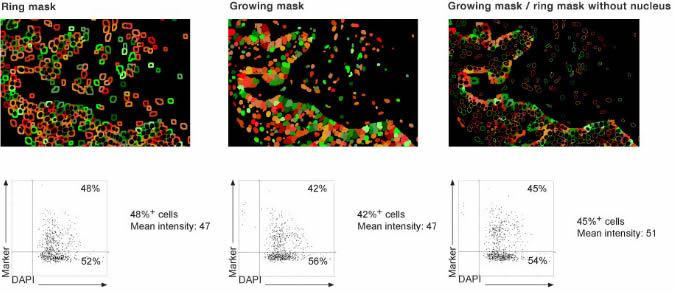 Анализ интенсивности окрашивания может быть ограничен в области ядра или может быть продлен в цитоплазму. В случае цитоплазматических антигенов TissueQuest применяет алгоритм обработки изображения, который распространяется на окрашенные области вокруг ядра.