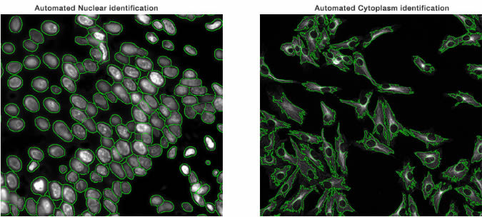 Отдельные клетки определяются путем применения различных шаблонов окраски (таких как ядра, кольцевые структуры и цитоплазма). Эти шаблоны могут быть выбраны пользователем. Шаблон для идентификации ядер используется для разделения клеток.