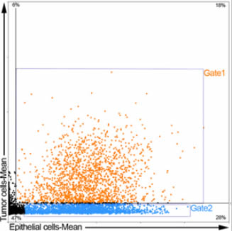 Выявленные клетки сразу же отображается на экране, в виде скатерограммы, с индикацией площади поверхности/интенсивности окрашивания. Также, как в проточной цитометрии, каждая точка соответствует отдельной клетке.