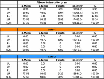 Расчетные параметры включают в себя среднюю интенсивность, относительные/абсолютные события и процент реактивных клеток.